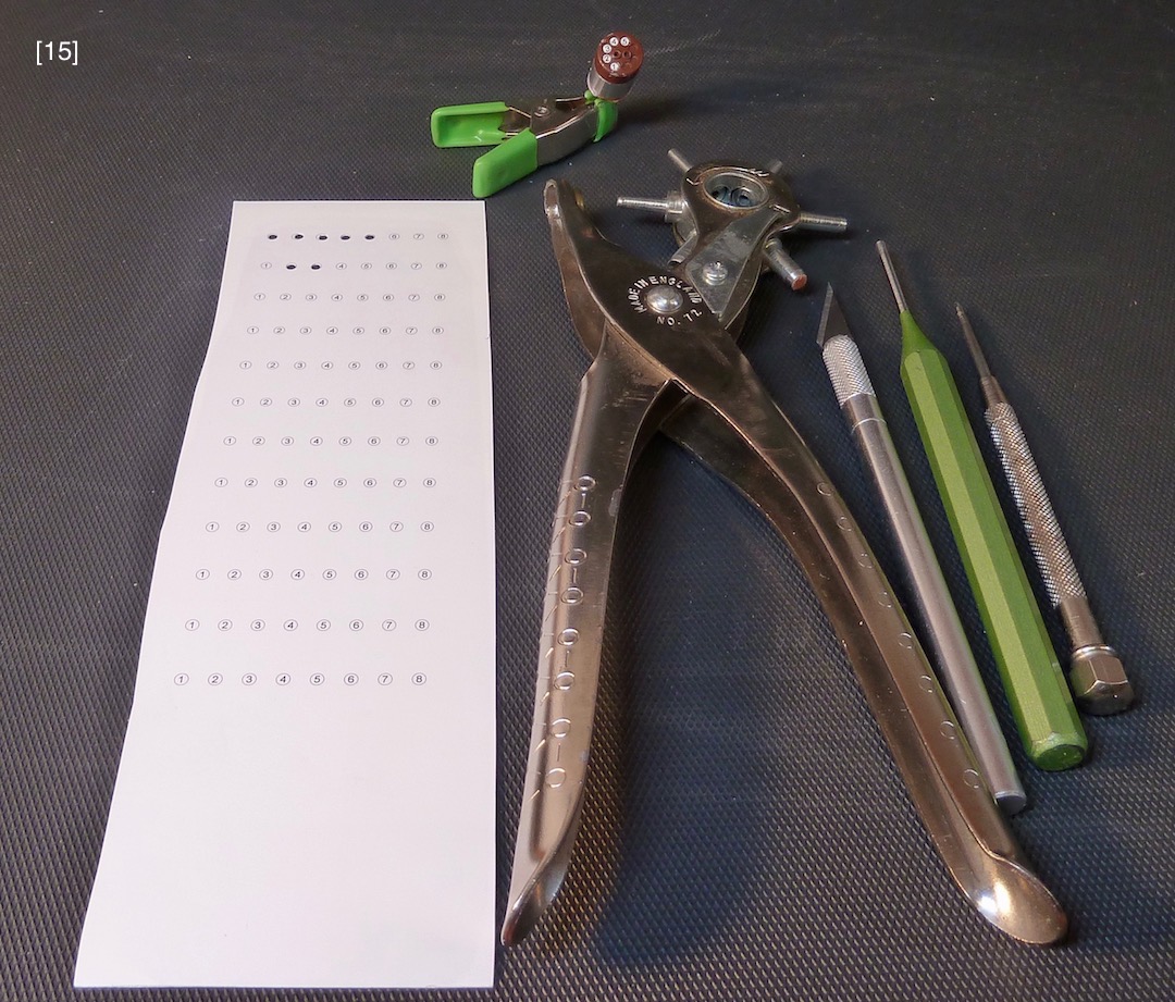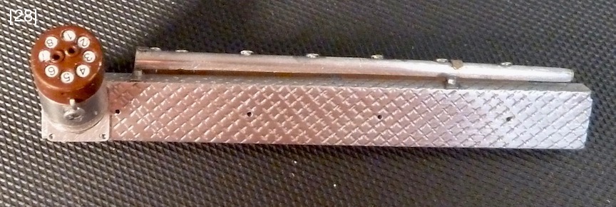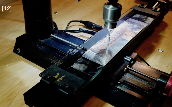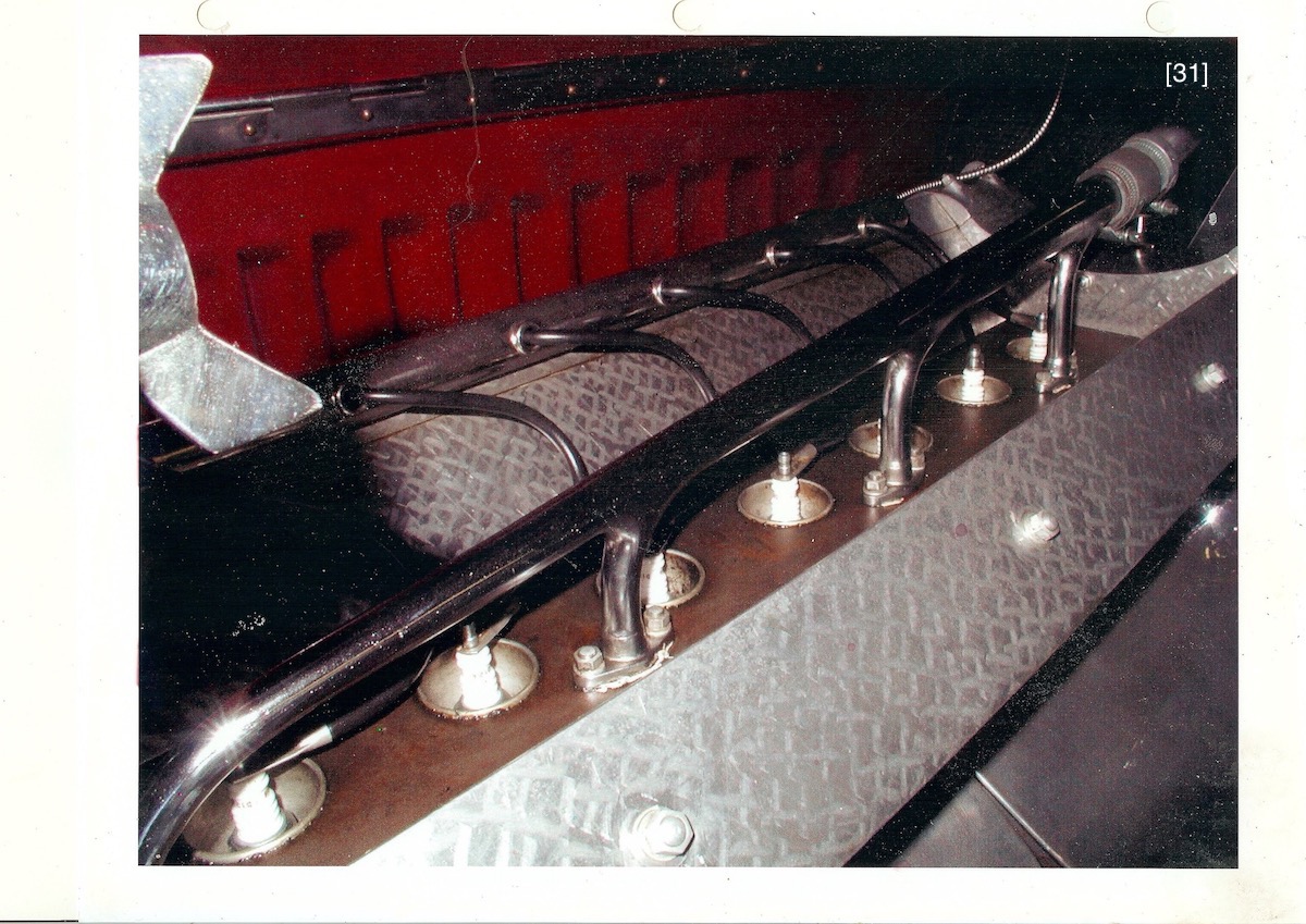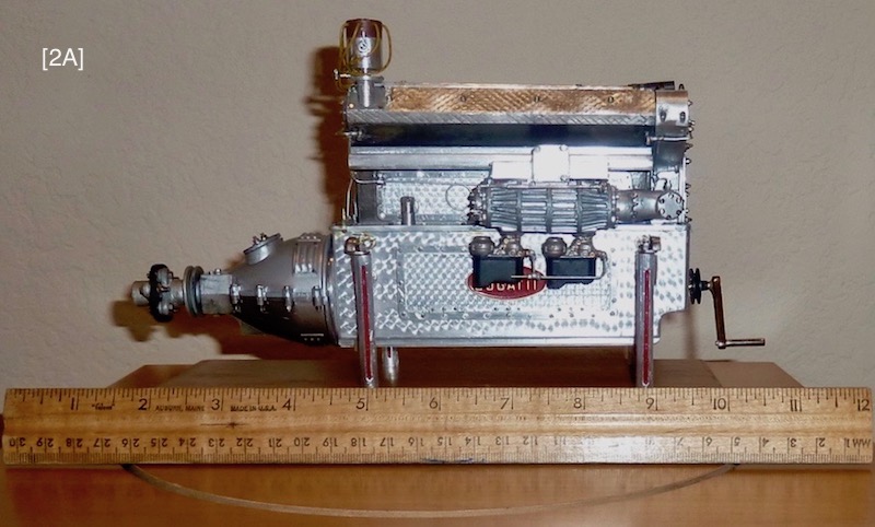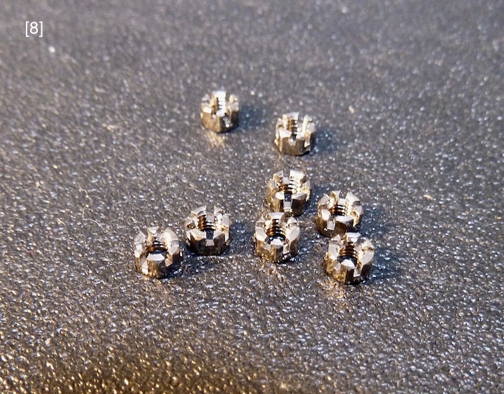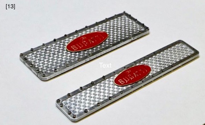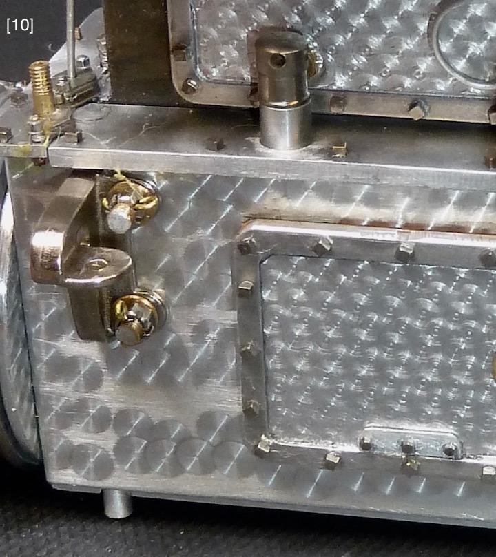 Four large access plates show the visual “punch” of actual aluminum parts, [11] [13] [14] [27] . Their “engine-turning” was applied differently than the sump’s. It was burnished onto aluminum duct tape, [12] , which was then cut to exact size, precisely aligned to the access plates, and applied. This method seems simple, but the tape is delicate, has aggressive adhesive, wrinkles easily, and sticks hard to itself, a combination that required fastidious handwork. However, this method allays some risk since a burnishing error that ruins some duct tape is inconsequential compared to an error that ruins a sump or access plate. “Rubber gaskets” under the access plates are orange colored paper, [10A] . The 1.2mm simulated (thread less) square head bolts, [10] , came from Marvin Meit of ModelMotorcars (MMC), a supplier of micro hardware, metals, specialty tools, Pocher kits, after-market parts, and helpful support.