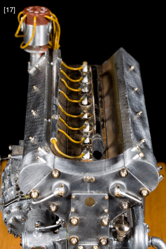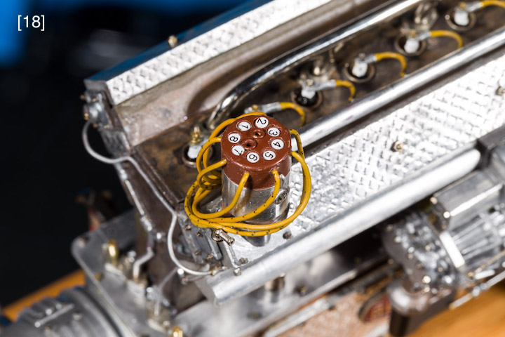 The complicated shapes of the clutch housing, water pump, supercharger, and carburetors were beyond the CNC software’s capabilities, so I painted those plastic kit parts with Testor’s silver/aluminum enamel, a deliberate mismatch with aluminum metal to imply a different foundry, [26] . I cut or filed off Pocher’s molded plastic fasteners, replacing them with individual nickel-plated micro-fasteners. Manipulation of these fussy fasteners is an acquired skill.