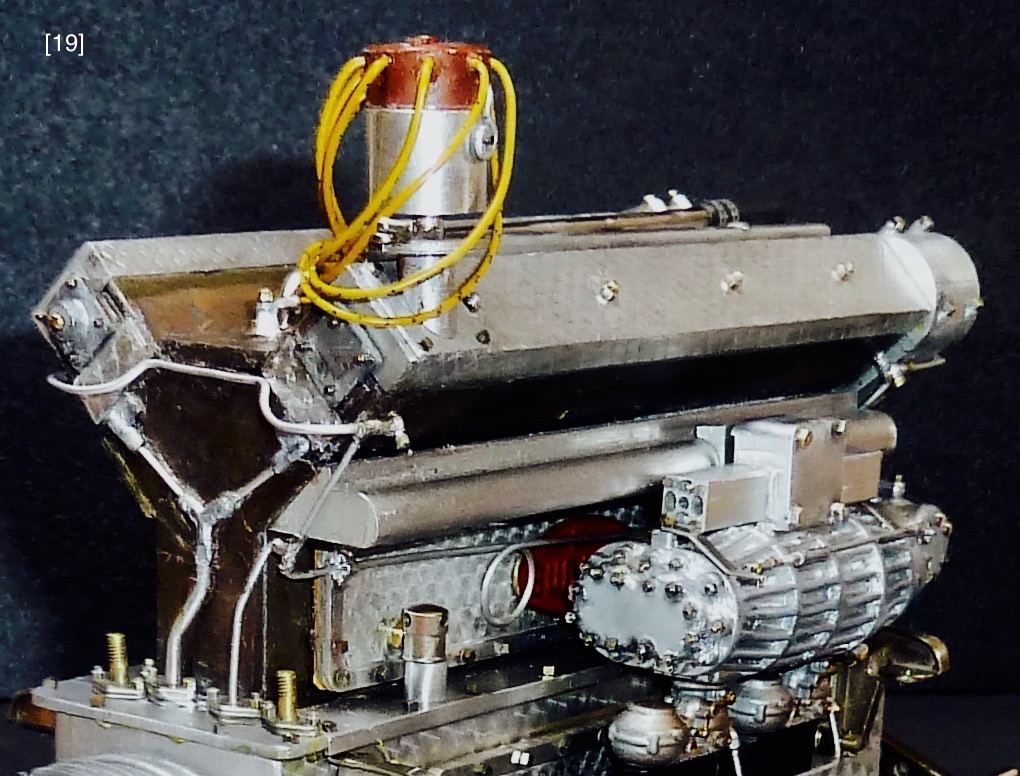 View-ports on the block’s left side display moving internal parts when the engine is cranked, [27] . Notice the Pocher kit’s three piston rings and the crankshaft. Only the left camshaft, one valve train, and the three power assemblies were needed, but their motions were sporadic because Pocher’s thin rubber fan belt slipped. Pocher expected the fan belt to drive two camshafts, and sixteen valve trains, but kit builders found it undependable, [27A] I unsuccessfully tried a plastic spur-gear drive, [20] [24] . A quality metal spur gear or bevel gear train might work.