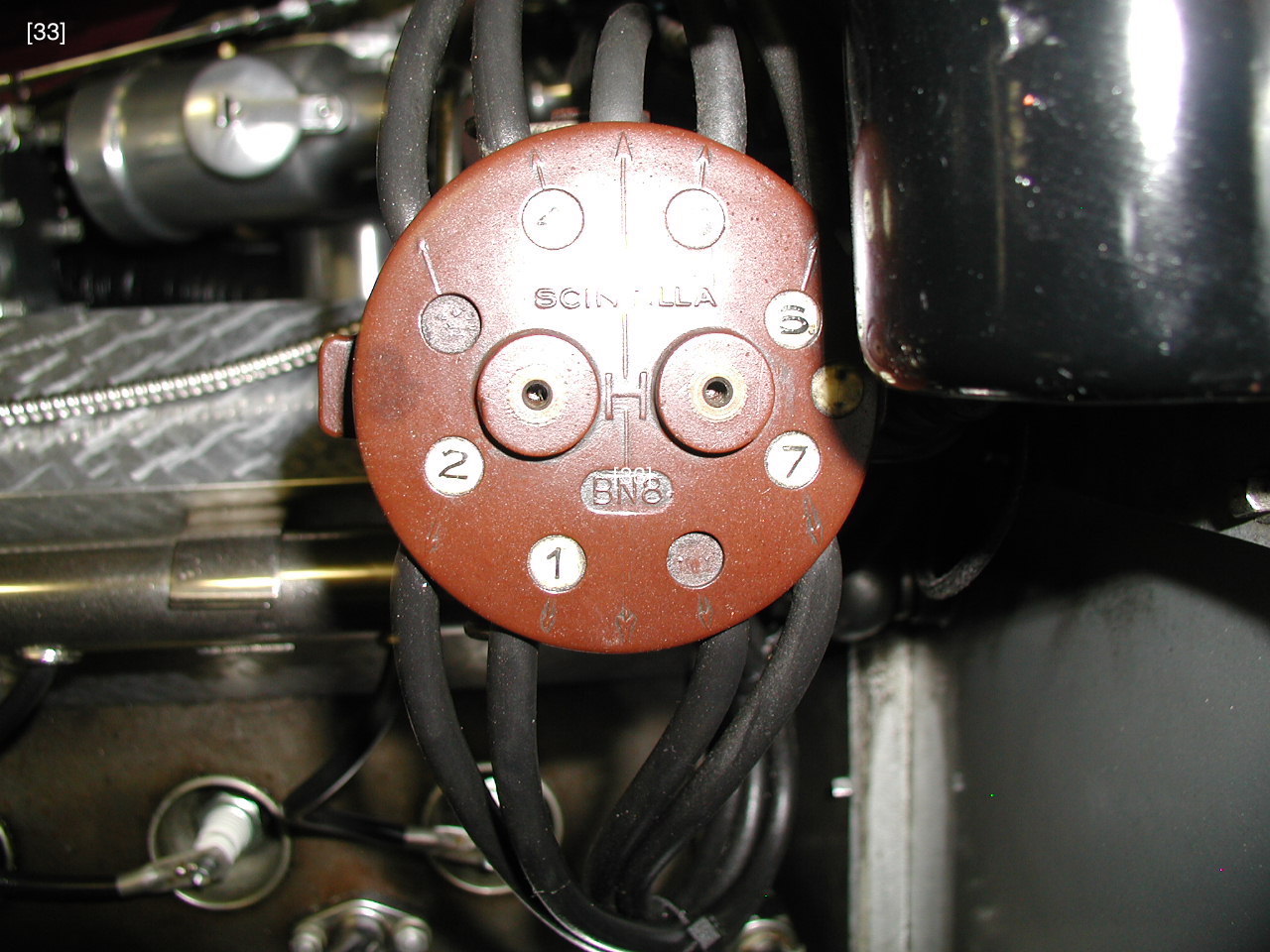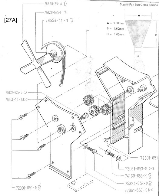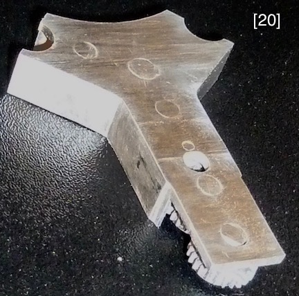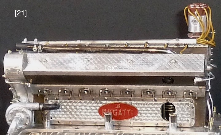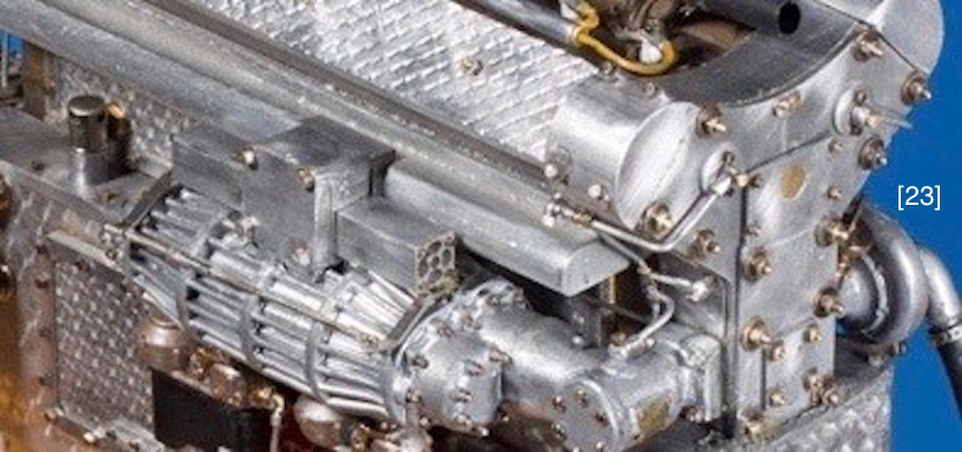 Modeling the cylinder head took some outsourcing. Sparkplugs, ignition wire, and water manifold, came from MMC. Sparkplug wells were cut from conical beadwork trinkets sold in craft stores, [16] . The ignition wire loom is a tapered aluminum rod drilled for wires to seemingly enter, run through, and exit, [28] . Bugatti’s exposed cast iron parts acquired a rusty-brownish-taupe patina over time, which was matched with a mix of Testor’s brown, rust, and graphite enamels, [17] . Bugatti fitted some engines with Sinctilla distributors whose caps enumerated firing order, [18] . I turned an aluminum distributor body and cap and then indexed and end-milled depressions on the cap to receive number stickers from a fast-print shop [15] . I modeled the 1-2-3-4-5-6-7-8 sequential firing order as on a prototype cap, [33] , but specifications from the “Bugatti Trust”, a Bugatti preservation group, show 1-6-2-5-8-3-7-4, [18A] . Spiral spring latches holding the cap are coiled 1mm aluminum rod, [19] . Notice how exposed to the elements the entire ignition system is. The “Y” shaped front gearbox, with its inspection plates and many fasteners, suggests power, [29] . A dusty trigonometry book helped me program the Sherline mill to execute the gearbox’s pleasing shape, and the mill’s quality provided the accuracy for this part to match-up with 16 adjacent edges and surfaces.