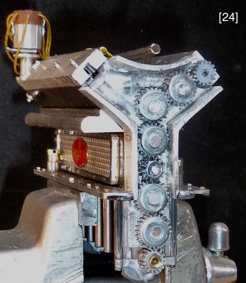 The iconic camshaft covers were milled from aluminum bar and half round stock. Bolt bosses were 1/16” aluminum tubing press-fitted into drilled holes. The “hand-scraped” surface pattern was applied in two opposite 45° passes of the work piece under a spherical burr taking “brush” cuts, [21] . The over-boost air box has two outlet stacks with crowded arrays of outlet ports, [22] [23] . I drew this port pattern scaled up 5:1 on grid paper, arithmetically assigned numerical values, which the grid verified, programed those values, and the Sherline milled the arrays faithfully. An adaptor mates this box to the bull-nosed intake manifold, [25] . The engine’s exhaust manifold, with its studs awaiting future exhaust pipes, was CNC milled and drilled, [21]. The starter was turned and then detailed with a brush housing, labels, and rear-bearing housing, [7] . Castle nuts were 2.5mm hex nuts, slotted with a 0.5mm-slitting saw. Cotter pins are modified tiny model ship wire fittings. [8] [9] [10] . The external oil piping of the lubrication system was an aftermarket kit of 1mm aluminum rod, miniature pipe fittings, and pipe terminals called “banjos”, [19] [29]. The rear apron, where circulated oil returns to the sump, was scratch built.