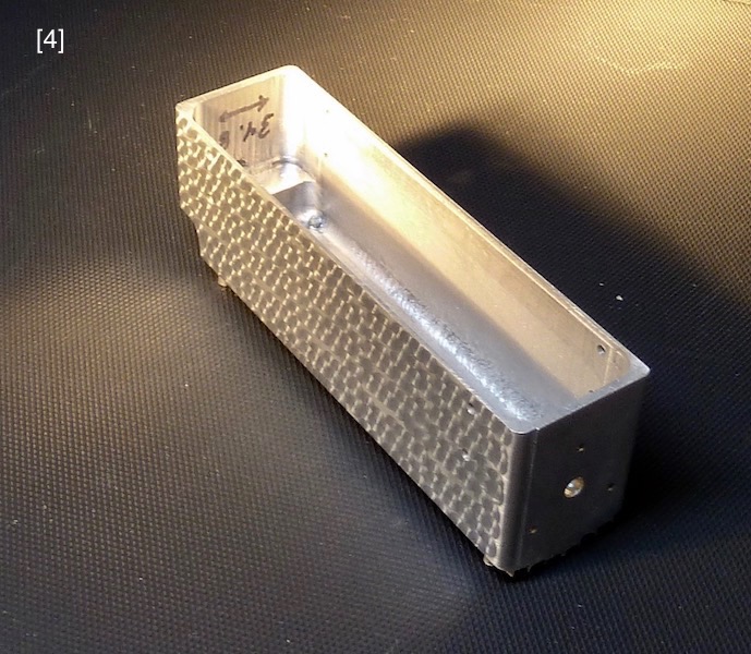 Photographs [1] [2] [2A] present the completed model. I began with the oil-sump, which took about 60 hours of programing, testing, and milling to shape. There’s a lot of aluminum to remove from a 50x60x200mm billet to arrive at a thin-walled 35x46x135mm part, and the Sherline mill removes only 1.5 – 3.0mm per pass, [3] [4] . The “engine-turning” swirl pattern was burnished directly onto the sump using a Sherline sensitive drilling attachment as the CNC program positioned the sump sequentially, for three-second intervals, below a rotating Dremel 532-02 stainless brush, enough time to depress the touch-plate, which brought the brush into contact with the work-piece, [5] [6] . This became rhythmic and easy to do. Bugatti applied patterns by hand resulting in some randomness, which was approximated in the CNC program. Such surface patterns can promote oil films to prohibit rust, however, Bugatti’s patterns, on non-rusting aluminum, were likely Art Deco styling cues.